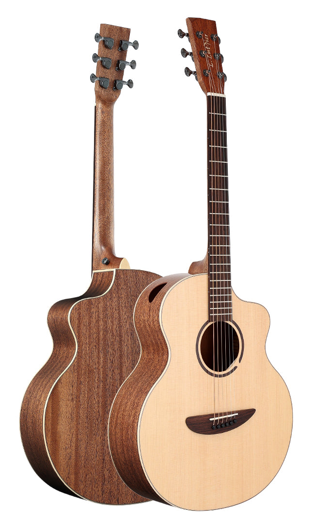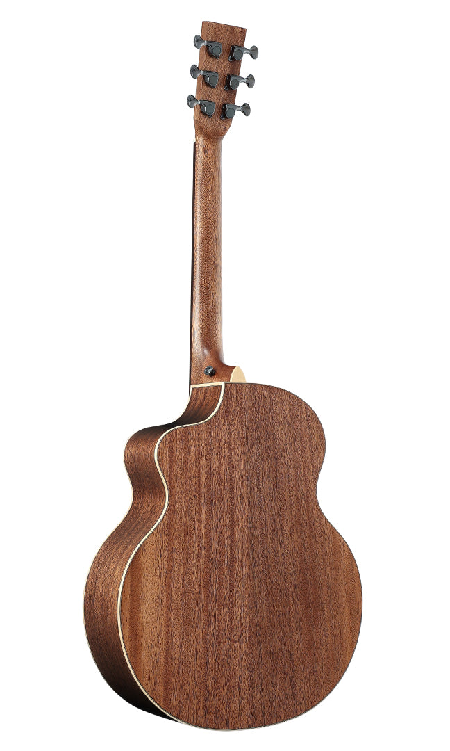 At the heart of its sound is a solid sitka spruce top, known for its responsiveness and mature, mellow character — perfect for fingerstyle players and expressive strummers. The laminated mahogany back and sides provide strength and depth to the tone, while the mahogany neck and rosewood fretboard ensure smooth playability.
