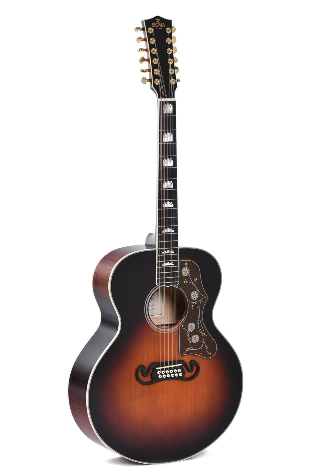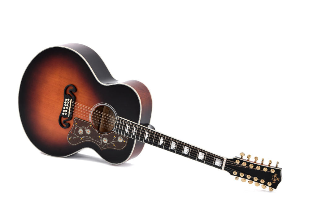 The GJA12-SG200 is a full scale 12 string acoustic guitar, equipped with the Fishman Sonitone electric preamp installed in the guitar. This model is built with a solid sitka spruce top and mahogany back and sides topped off with a beautiful dark vintage sunburst gloss finishing. The fretboard carries beautiful crowned inlays to enhance the aesthetic appearance.